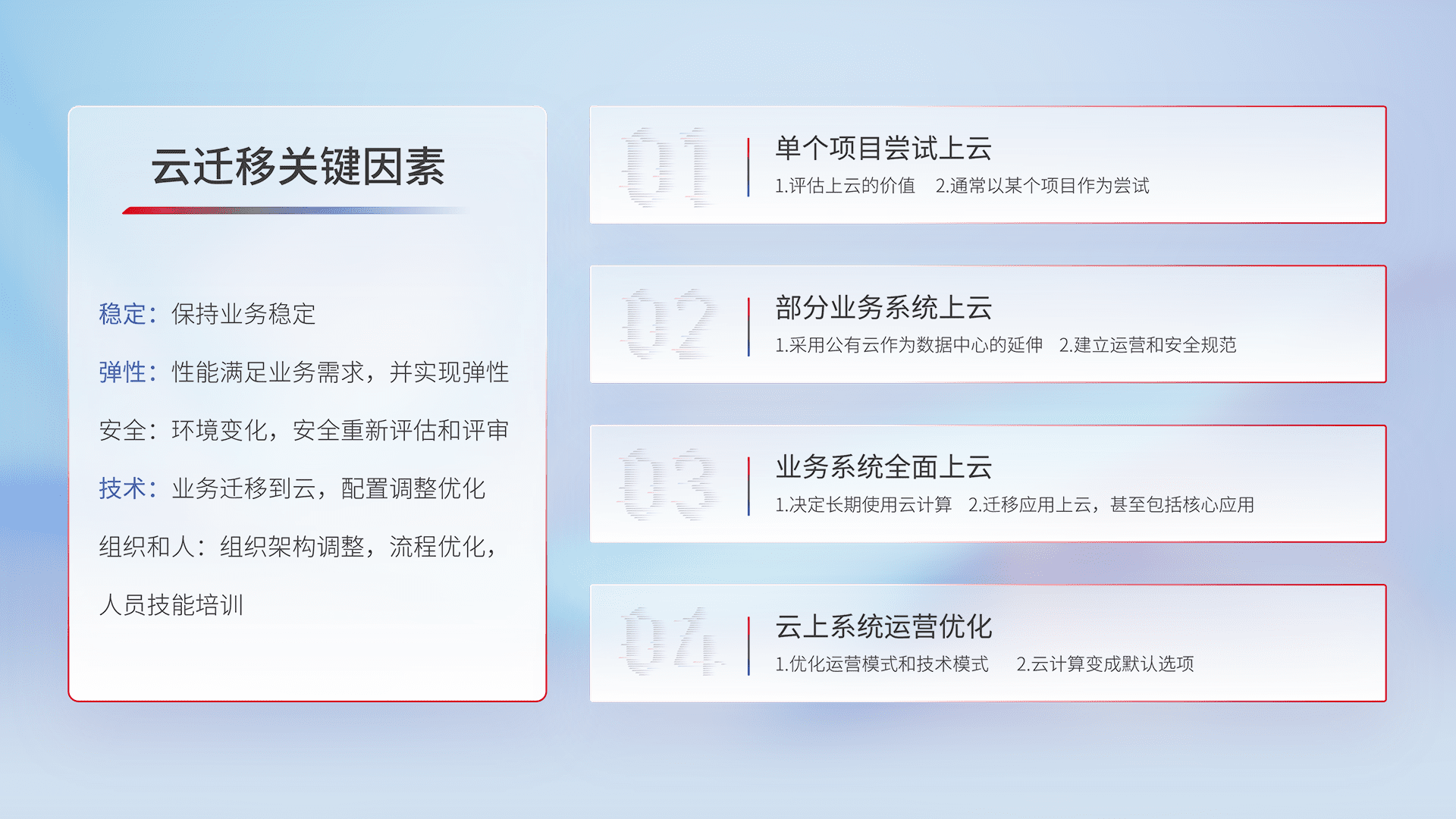 结合实际业务,,从规划设计、、云平台选型、、云原生改造、、数据迁移、、、、集成交付,,,,迁移全过程为客户识别最佳上云路径,,,做好风险识别管理,,设计网络架构、、、身份权限、、、安全审计合规、、、、操作审计、、、、日志审计、、、、监控告警策略、、多站点容灾设计等,,,,对云上基础设施进行整体规划,,,提升IT治理水平,,以满足弹性、、、高可用、、、高性能的需求。。