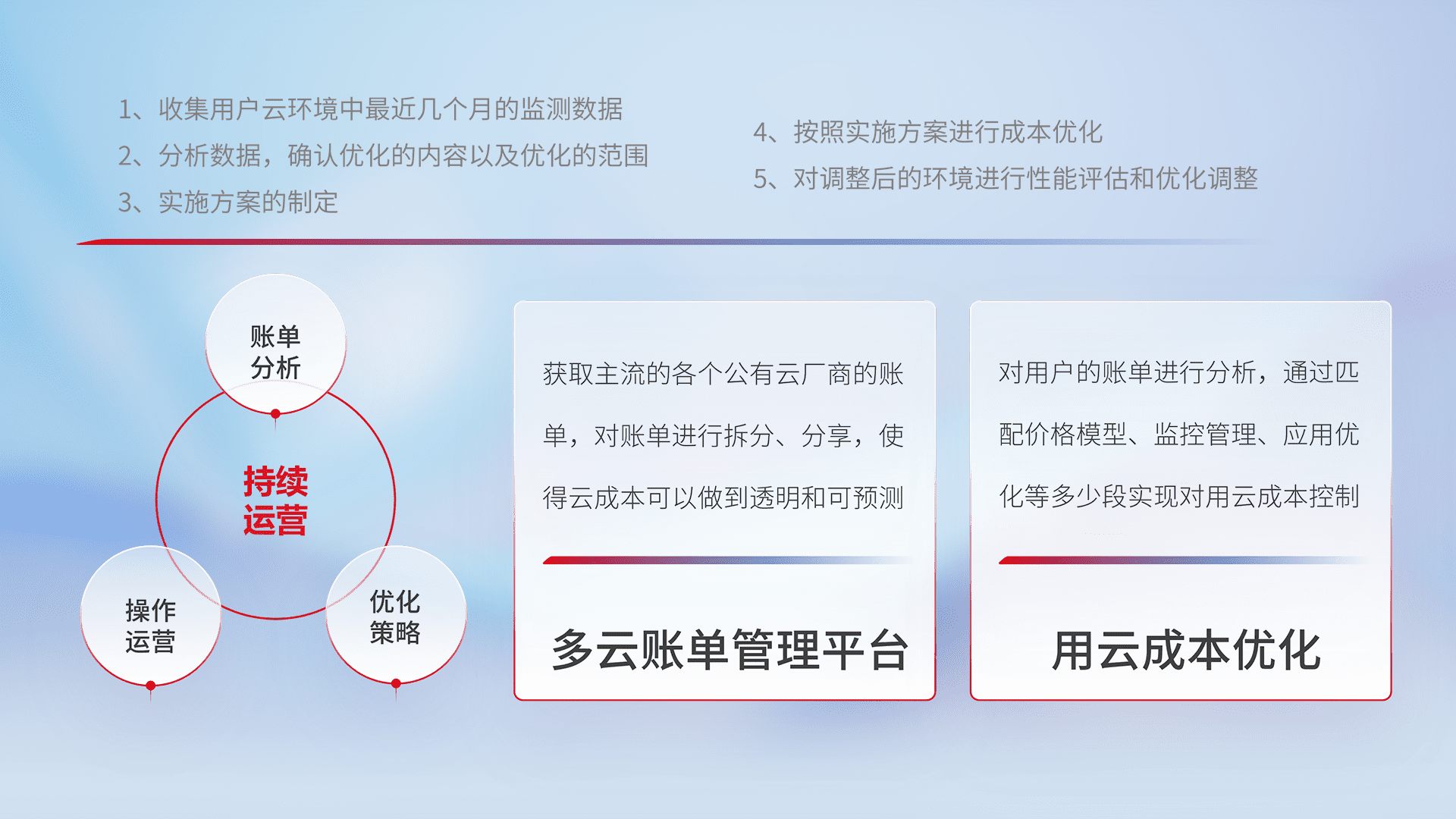 通过多云纳管,,,以统一的资源数据模型把客户的云资源进行抽象和封装,,进而实现对多云资源的统一操作,,,保障云资源管理的可靠性、、、稳定性与可用性。。。。量身定制化运维内容,,配置、、、开发运维、、补丁管理、、、、备份、、、监控、、、认证和访问管理、、审计和日常巡检等,,,保障在用云过程中的可靠度,,,稳定度以及高可用率。。