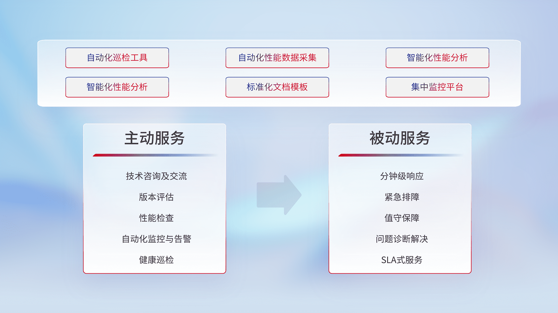 智能化工具和标准化文档,,保障服务质量,,,,提供主动服务(包含技术咨询、、版本评估、、、性能检查、、自动化监控与告警、、健康巡检)和被动服务包含(分钟级响应、、紧急排障、、、、值守保障、、问题诊断解决、、、SLA服务)。。